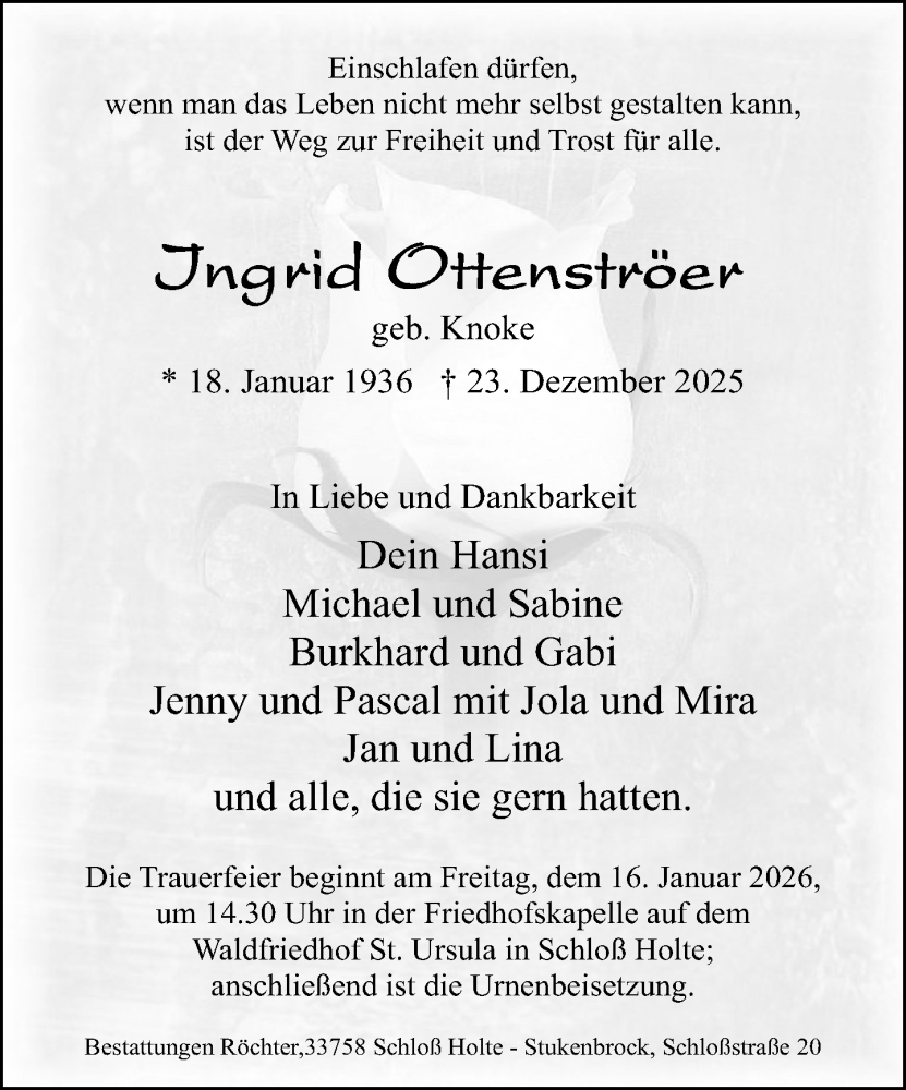 Hier finden Sie alle Traueranzeigen aus der Zeitung, die bisher für Ingrid Ottenströer erschienen sind. Weitere Traueranzeigen, die in der Zeitung erscheinen, werden hier ebenfalls aufgelistet