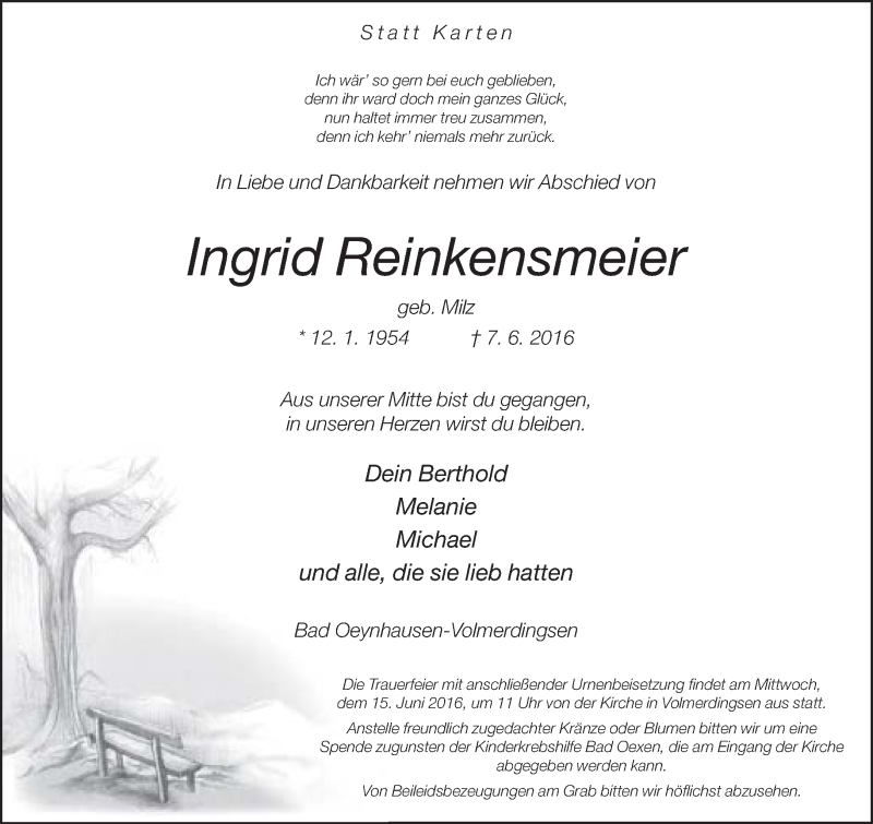 Hier finden Sie alle Traueranzeigen aus der Zeitung, die bisher für Ingrid Reinkensmeier erschienen sind. Weitere Traueranzeigen, die in der Zeitung erscheinen, werden hier ebenfalls aufgelistet