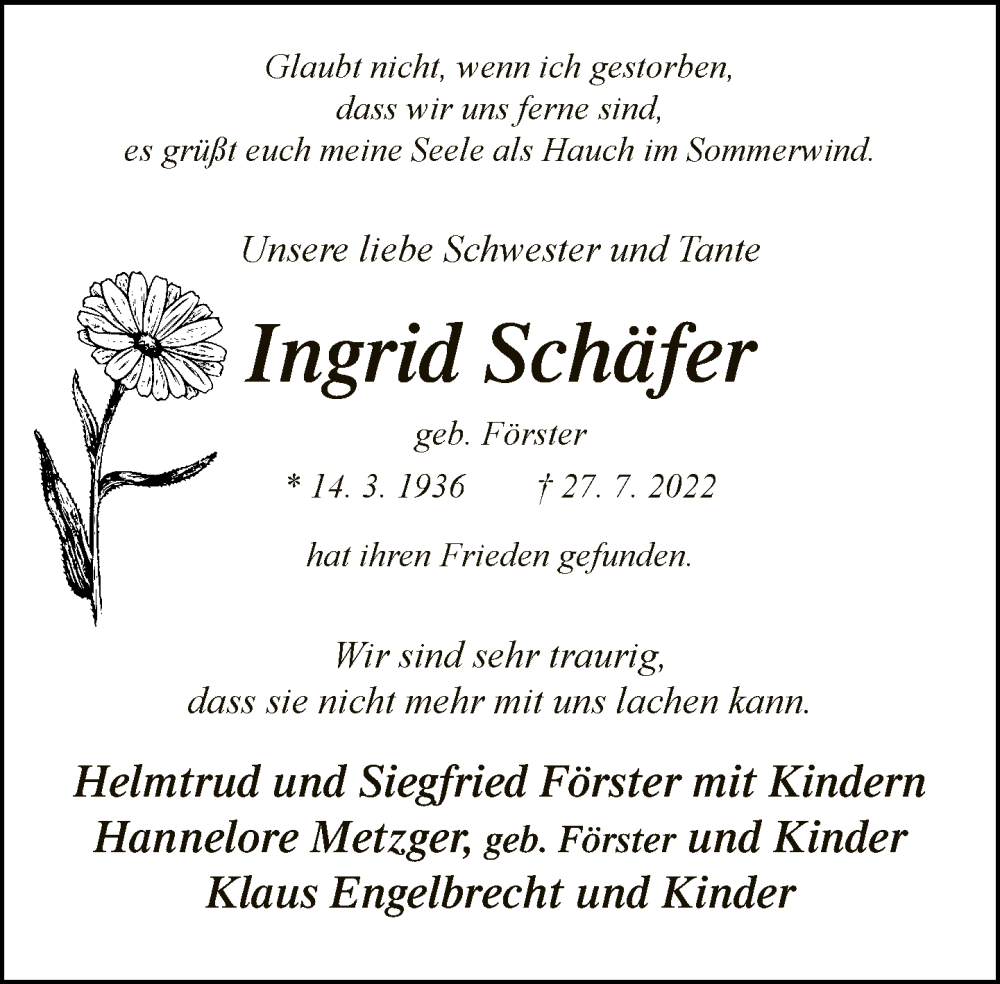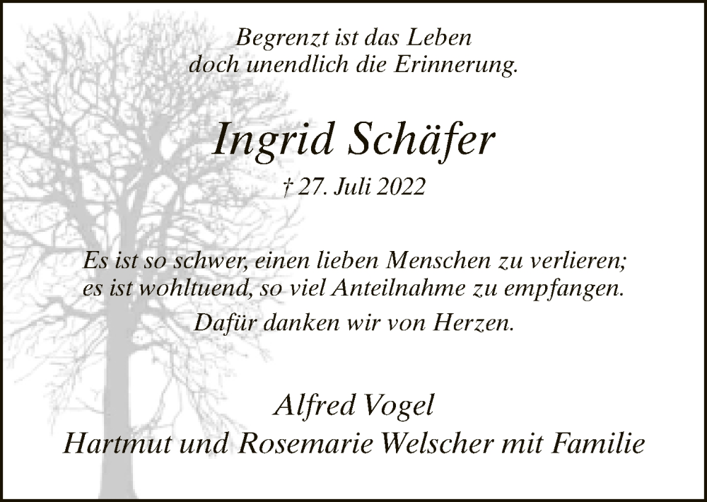 Hier finden Sie alle Traueranzeigen aus der Zeitung, die bisher für Ingrid Schäfer erschienen sind. Weitere Traueranzeigen, die in der Zeitung erscheinen, werden hier ebenfalls aufgelistet