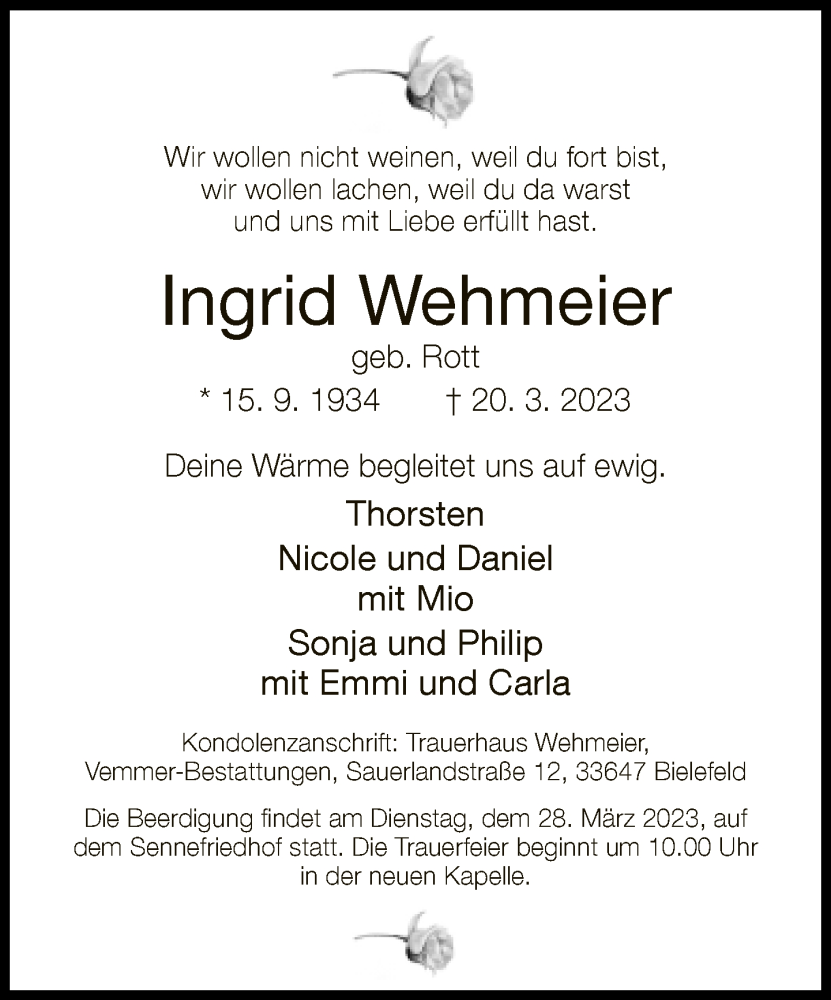 Hier finden Sie alle Traueranzeigen aus der Zeitung, die bisher für Ingrid Wehmeier erschienen sind. Weitere Traueranzeigen, die in der Zeitung erscheinen, werden hier ebenfalls aufgelistet
