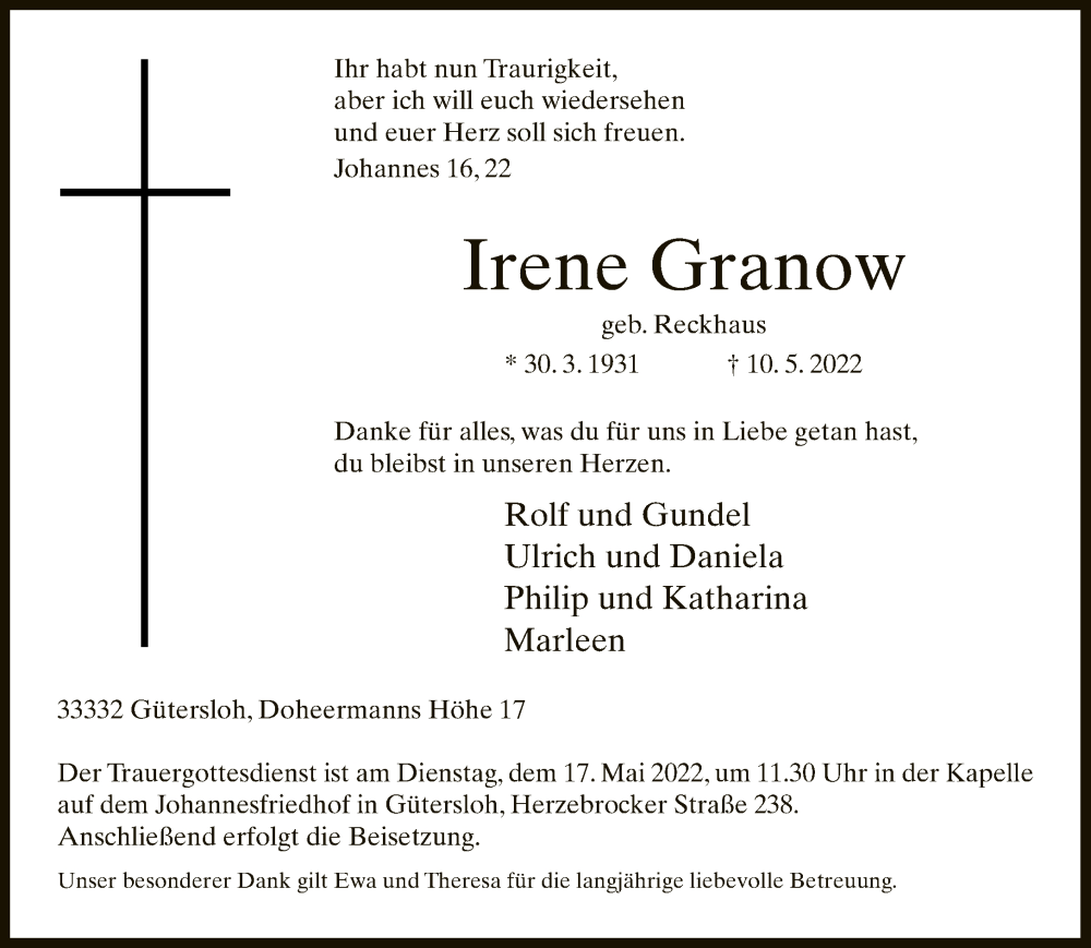 Hier finden Sie alle Traueranzeigen aus der Zeitung, die bisher für Irene Granow erschienen sind. Weitere Traueranzeigen, die in der Zeitung erscheinen, werden hier ebenfalls aufgelistet