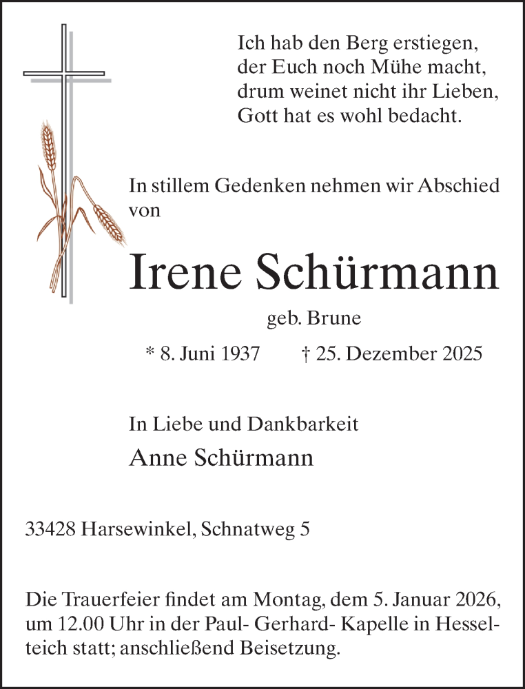 Hier finden Sie alle Traueranzeigen aus der Zeitung, die bisher für Irene Schürmann erschienen sind. Weitere Traueranzeigen, die in der Zeitung erscheinen, werden hier ebenfalls aufgelistet
