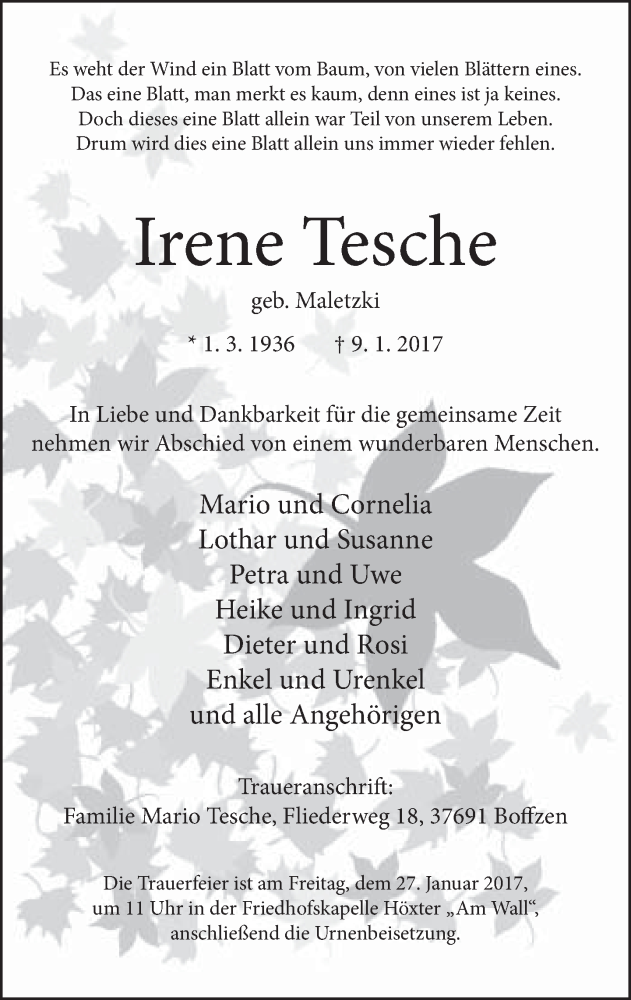 Hier finden Sie alle Traueranzeigen aus der Zeitung, die bisher für Irene Tesche erschienen sind. Weitere Traueranzeigen, die in der Zeitung erscheinen, werden hier ebenfalls aufgelistet