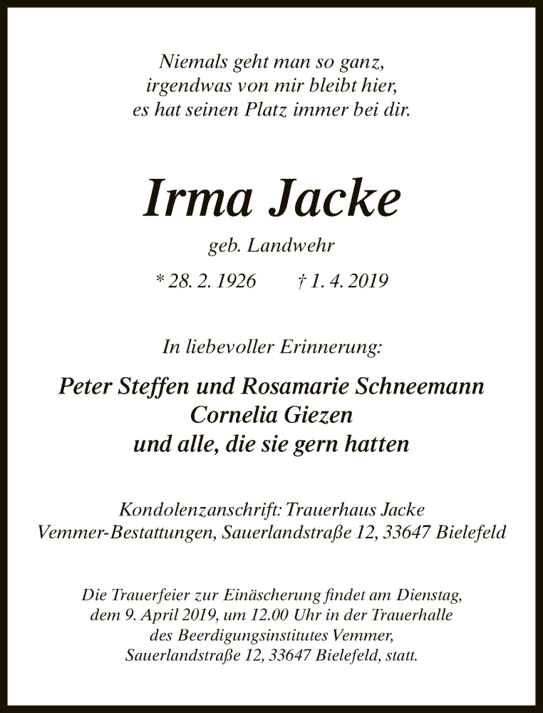 Hier finden Sie alle Traueranzeigen aus der Zeitung, die bisher für Irma Jacke erschienen sind. Weitere Traueranzeigen, die in der Zeitung erscheinen, werden hier ebenfalls aufgelistet