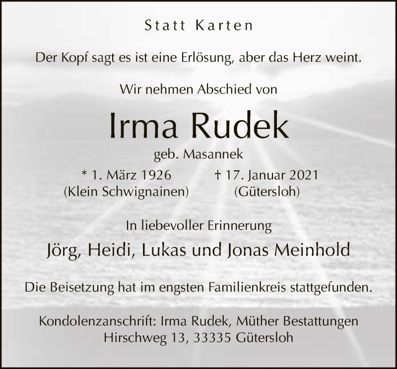 Hier finden Sie alle Traueranzeigen aus der Zeitung, die bisher für Irma Rudek erschienen sind. Weitere Traueranzeigen, die in der Zeitung erscheinen, werden hier ebenfalls aufgelistet