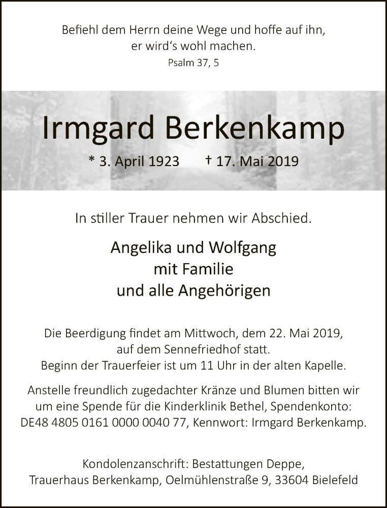 Hier finden Sie alle Traueranzeigen aus der Zeitung, die bisher für Irmgard Berkenkamp erschienen sind. Weitere Traueranzeigen, die in der Zeitung erscheinen, werden hier ebenfalls aufgelistet