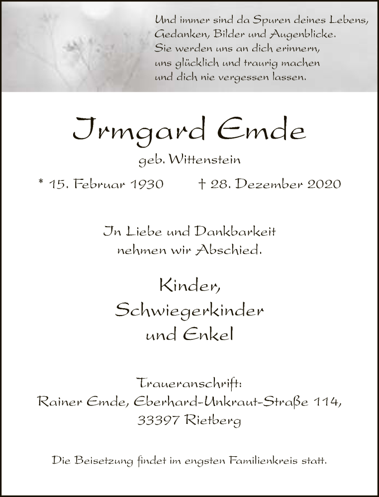 Hier finden Sie alle Traueranzeigen aus der Zeitung, die bisher für Irmgard Emde erschienen sind. Weitere Traueranzeigen, die in der Zeitung erscheinen, werden hier ebenfalls aufgelistet