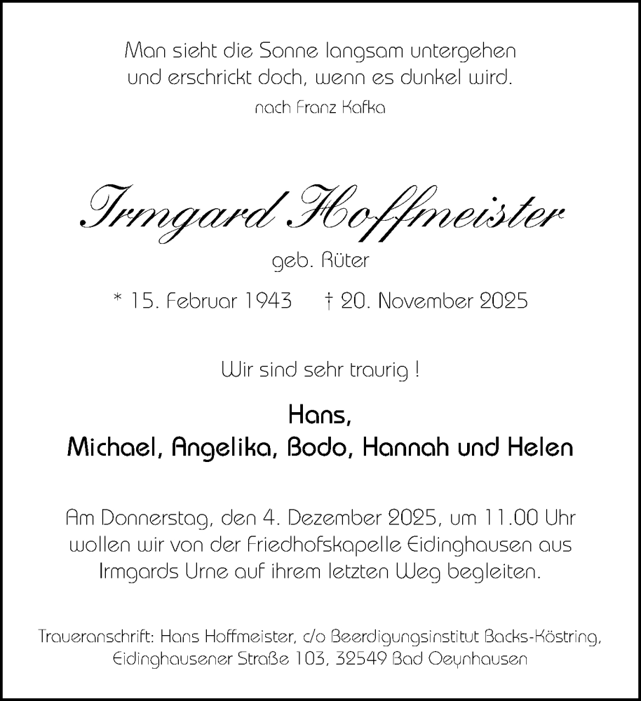 Hier finden Sie alle Traueranzeigen aus der Zeitung, die bisher für Irmgard Hoffmeister erschienen sind. Weitere Traueranzeigen, die in der Zeitung erscheinen, werden hier ebenfalls aufgelistet