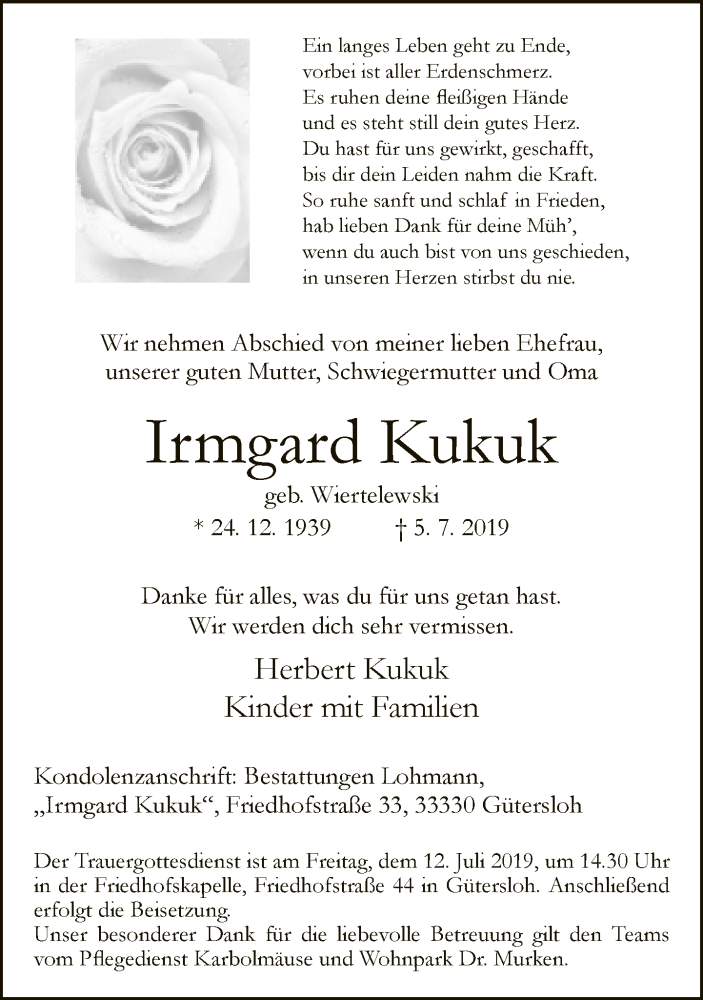 Hier finden Sie alle Traueranzeigen aus der Zeitung, die bisher für Irmgard Kukuk erschienen sind. Weitere Traueranzeigen, die in der Zeitung erscheinen, werden hier ebenfalls aufgelistet
