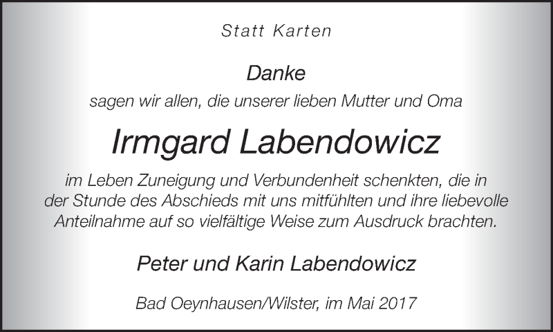 Hier finden Sie alle Traueranzeigen aus der Zeitung, die bisher für Irmgard Labendowicz erschienen sind. Weitere Traueranzeigen, die in der Zeitung erscheinen, werden hier ebenfalls aufgelistet