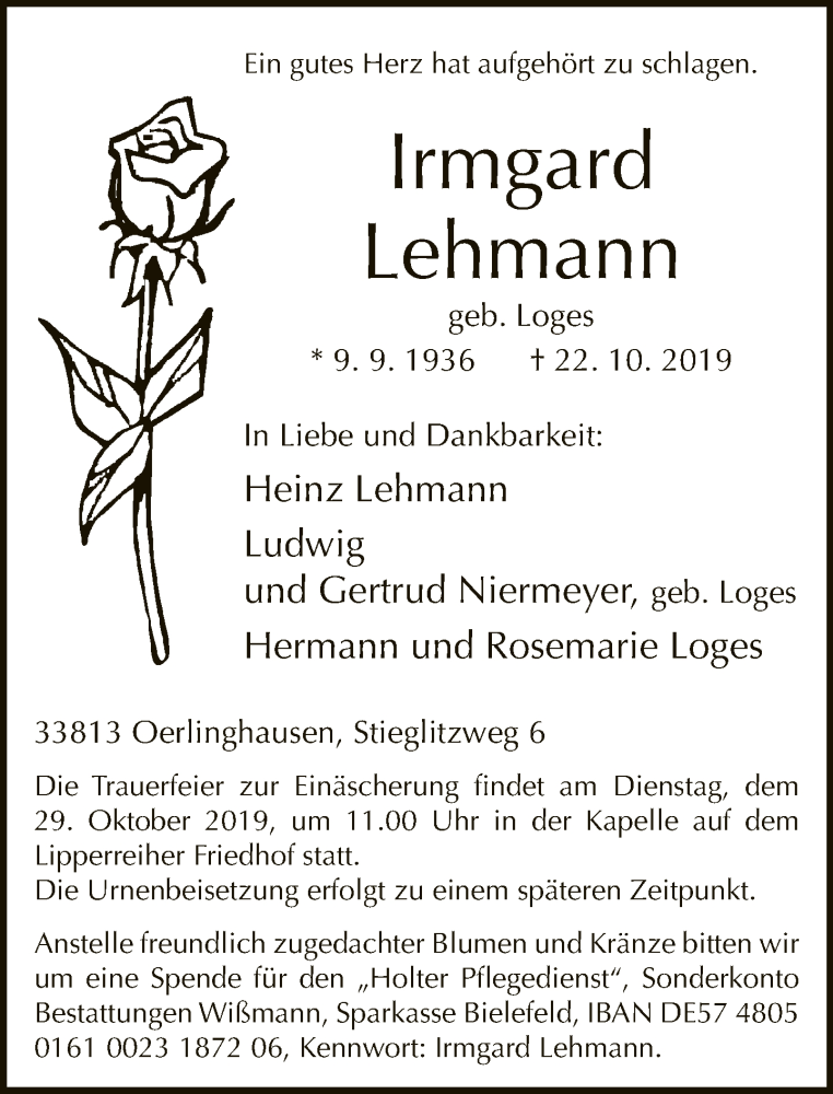 Hier finden Sie alle Traueranzeigen aus der Zeitung, die bisher für Irmgard Lehmann erschienen sind. Weitere Traueranzeigen, die in der Zeitung erscheinen, werden hier ebenfalls aufgelistet
