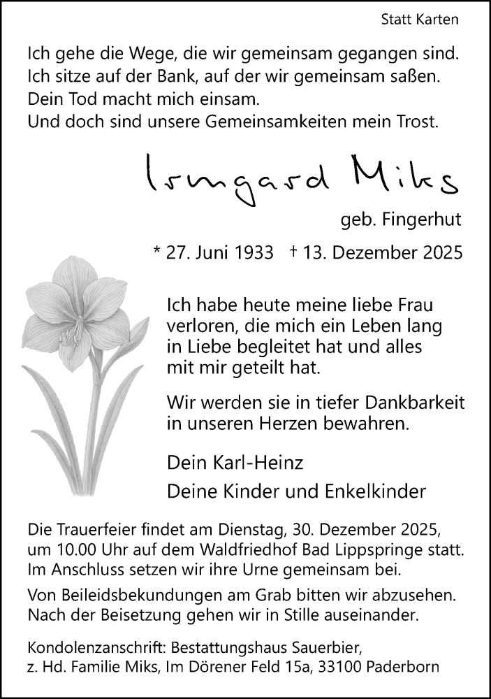 Hier finden Sie alle Traueranzeigen aus der Zeitung, die bisher für Irmgard Miks erschienen sind. Weitere Traueranzeigen, die in der Zeitung erscheinen, werden hier ebenfalls aufgelistet