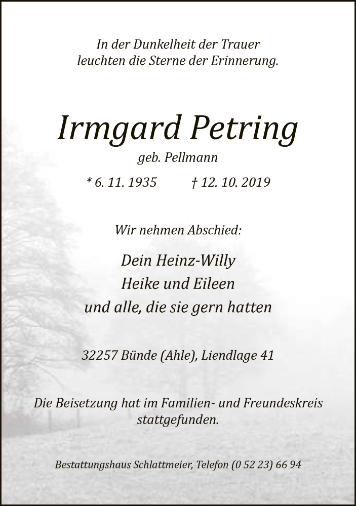 Hier finden Sie alle Traueranzeigen aus der Zeitung, die bisher für Irmgard Petring erschienen sind. Weitere Traueranzeigen, die in der Zeitung erscheinen, werden hier ebenfalls aufgelistet