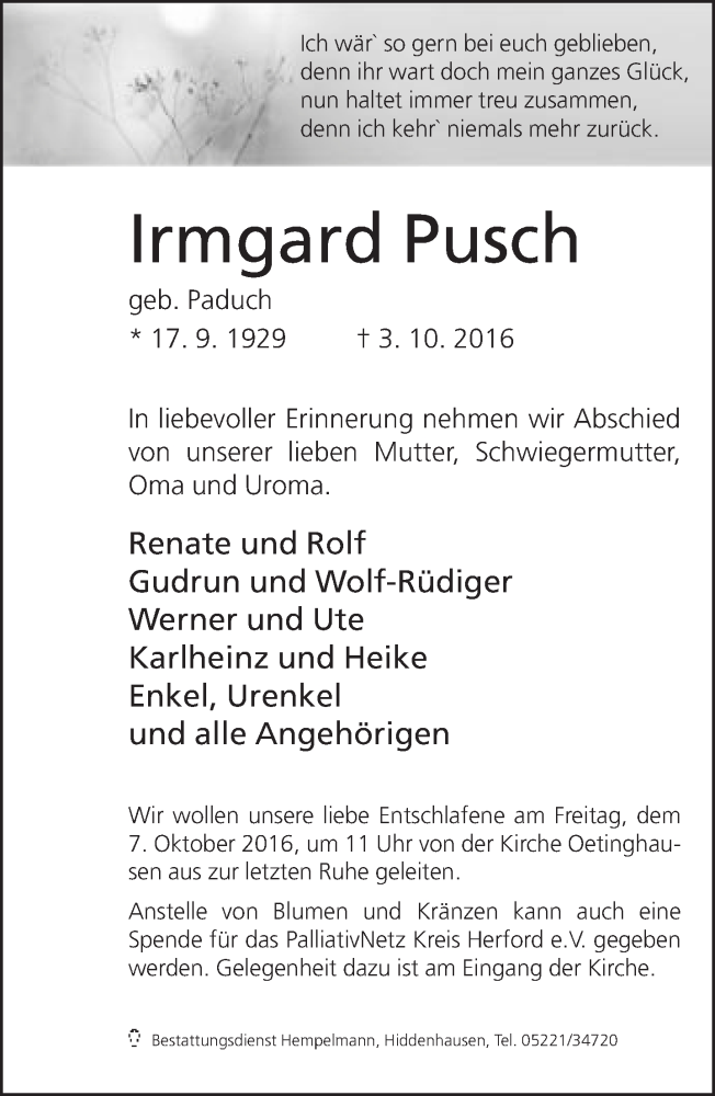 Hier finden Sie alle Traueranzeigen aus der Zeitung, die bisher für Irmgard Pusch erschienen sind. Weitere Traueranzeigen, die in der Zeitung erscheinen, werden hier ebenfalls aufgelistet