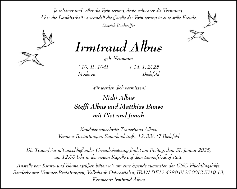 Hier finden Sie alle Traueranzeigen aus der Zeitung, die bisher für Irmtraud Albus erschienen sind. Weitere Traueranzeigen, die in der Zeitung erscheinen, werden hier ebenfalls aufgelistet