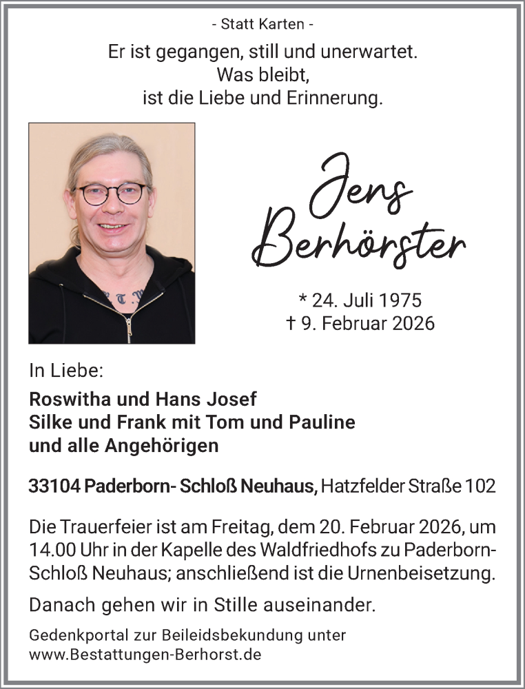 Hier finden Sie alle Traueranzeigen aus der Zeitung, die bisher für Jens Berhörster erschienen sind. Weitere Traueranzeigen, die in der Zeitung erscheinen, werden hier ebenfalls aufgelistet
