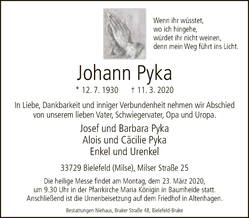 Hier finden Sie alle Traueranzeigen aus der Zeitung, die bisher für Johann Pyka erschienen sind. Weitere Traueranzeigen, die in der Zeitung erscheinen, werden hier ebenfalls aufgelistet