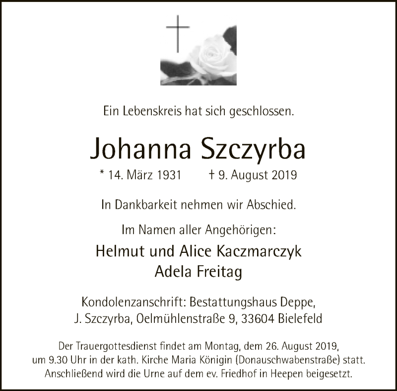 Hier finden Sie alle Traueranzeigen aus der Zeitung, die bisher für Johannes Szczyrba erschienen sind. Weitere Traueranzeigen, die in der Zeitung erscheinen, werden hier ebenfalls aufgelistet