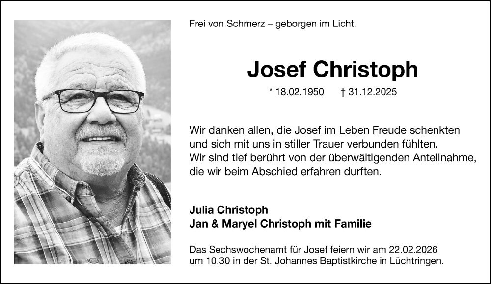 Hier finden Sie alle Traueranzeigen aus der Zeitung, die bisher für Josef Christoph erschienen sind. Weitere Traueranzeigen, die in der Zeitung erscheinen, werden hier ebenfalls aufgelistet