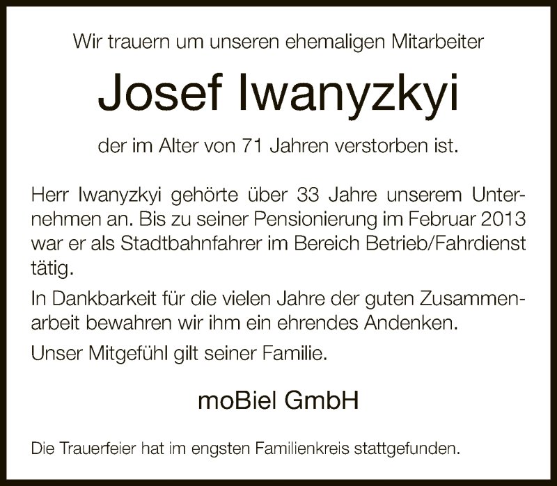 Hier finden Sie alle Traueranzeigen aus der Zeitung, die bisher für Josef Iwanyzkyi erschienen sind. Weitere Traueranzeigen, die in der Zeitung erscheinen, werden hier ebenfalls aufgelistet