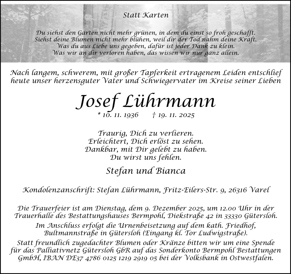 Hier finden Sie alle Traueranzeigen aus der Zeitung, die bisher für Josef Lührmann erschienen sind. Weitere Traueranzeigen, die in der Zeitung erscheinen, werden hier ebenfalls aufgelistet
