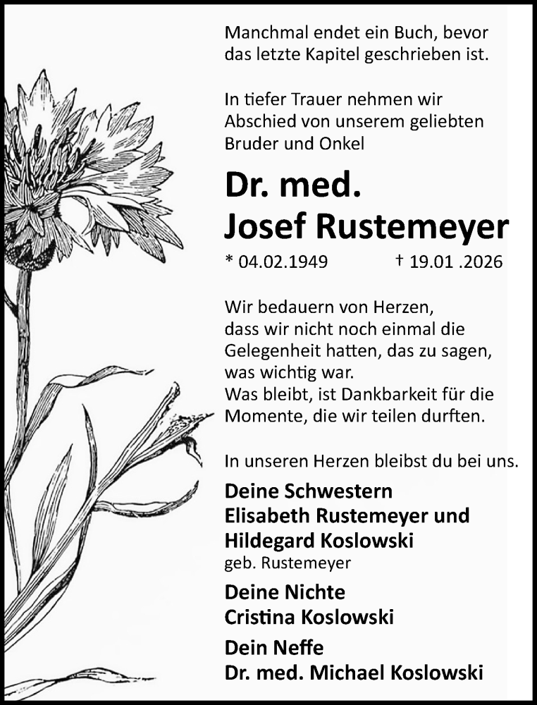 Hier finden Sie alle Traueranzeigen aus der Zeitung, die bisher für Josef Rustemeyer erschienen sind. Weitere Traueranzeigen, die in der Zeitung erscheinen, werden hier ebenfalls aufgelistet