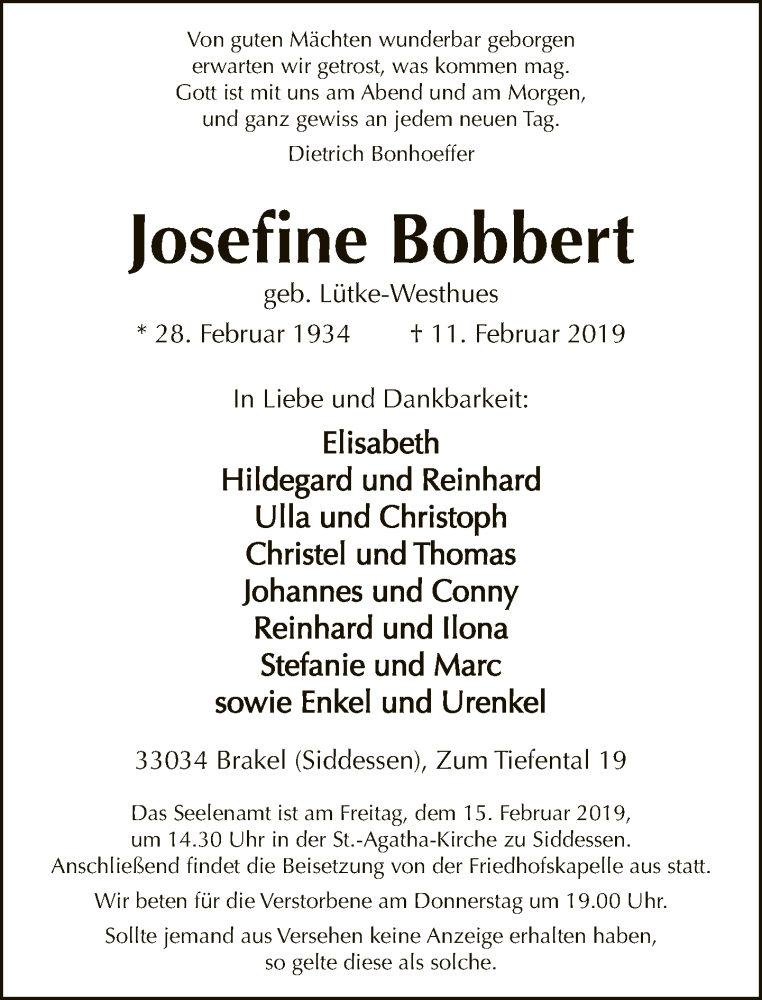 Hier finden Sie alle Traueranzeigen aus der Zeitung, die bisher für Josefine Bobbert erschienen sind. Weitere Traueranzeigen, die in der Zeitung erscheinen, werden hier ebenfalls aufgelistet