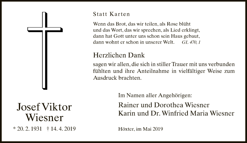 Hier finden Sie alle Traueranzeigen aus der Zeitung, die bisher für Josef Viktor Wiesner erschienen sind. Weitere Traueranzeigen, die in der Zeitung erscheinen, werden hier ebenfalls aufgelistet