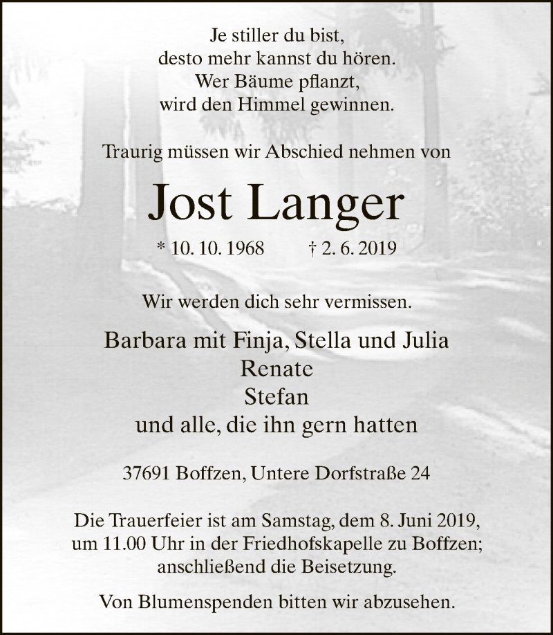 Hier finden Sie alle Traueranzeigen aus der Zeitung, die bisher für Jost Langer erschienen sind. Weitere Traueranzeigen, die in der Zeitung erscheinen, werden hier ebenfalls aufgelistet