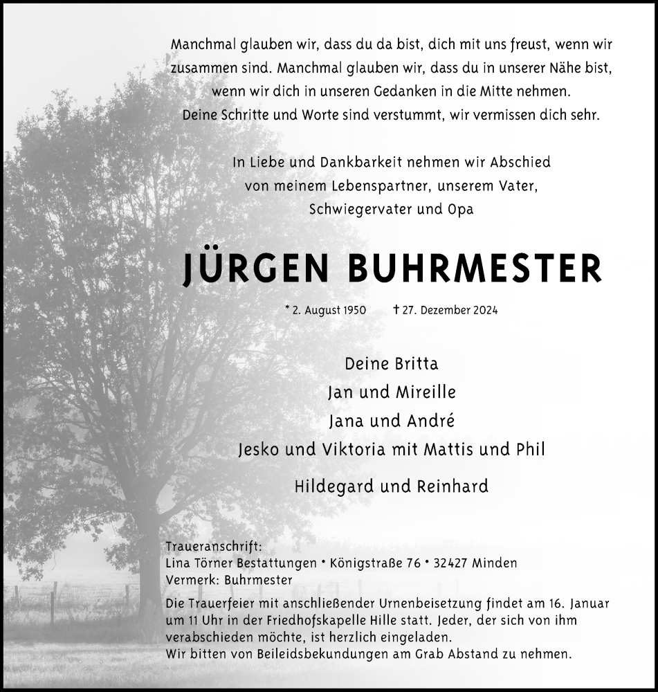 Hier finden Sie alle Traueranzeigen aus der Zeitung, die bisher für Jürgen Buhrmester erschienen sind. Weitere Traueranzeigen, die in der Zeitung erscheinen, werden hier ebenfalls aufgelistet