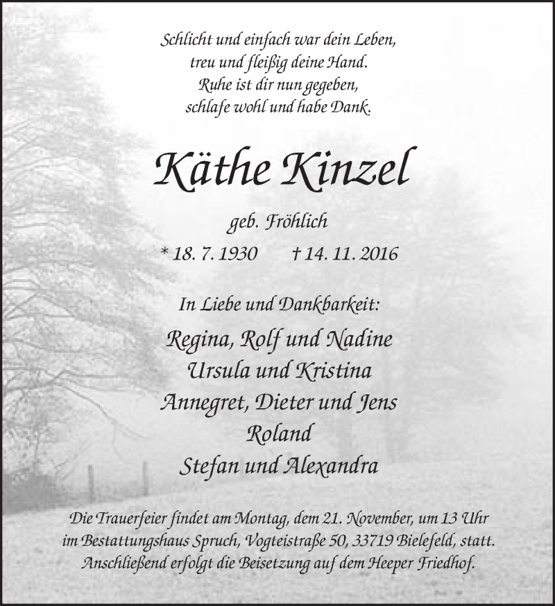 Hier finden Sie alle Traueranzeigen aus der Zeitung, die bisher für Käthe Kinzel erschienen sind. Weitere Traueranzeigen, die in der Zeitung erscheinen, werden hier ebenfalls aufgelistet