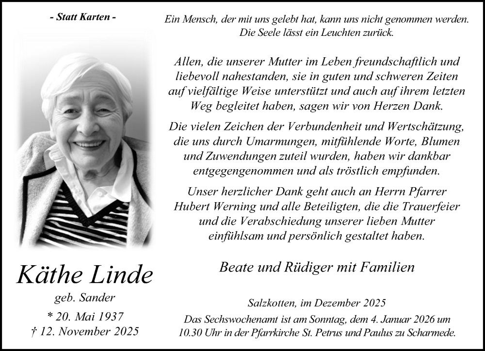 Hier finden Sie alle Traueranzeigen aus der Zeitung, die bisher für Käthe Linde erschienen sind. Weitere Traueranzeigen, die in der Zeitung erscheinen, werden hier ebenfalls aufgelistet