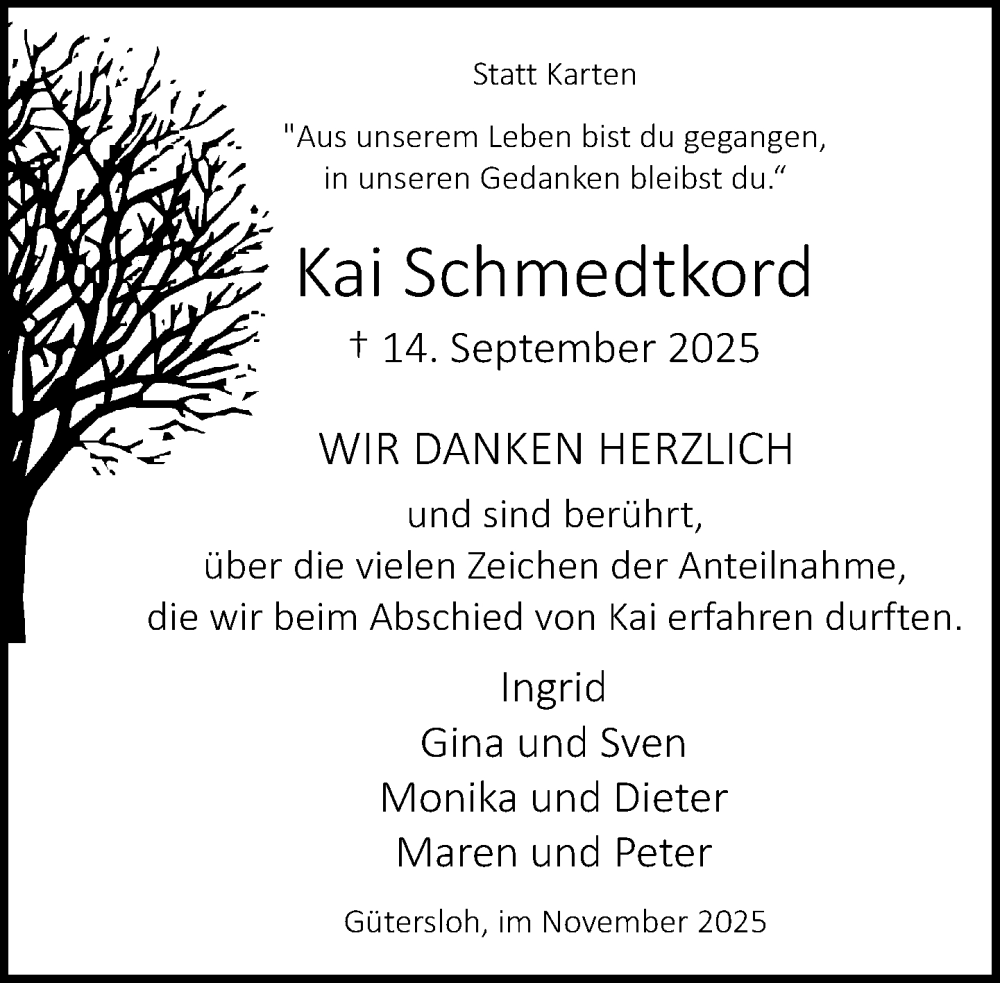 Hier finden Sie alle Traueranzeigen aus der Zeitung, die bisher für Kai Schmedtkord erschienen sind. Weitere Traueranzeigen, die in der Zeitung erscheinen, werden hier ebenfalls aufgelistet