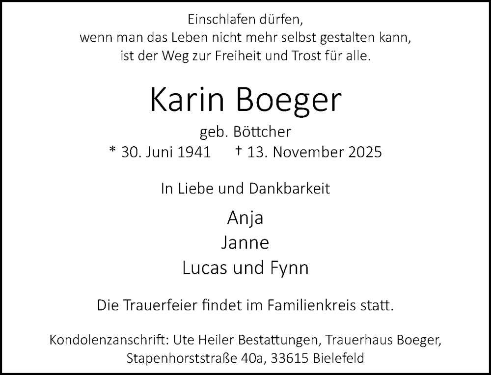 Hier finden Sie alle Traueranzeigen aus der Zeitung, die bisher für Karin Boeger erschienen sind. Weitere Traueranzeigen, die in der Zeitung erscheinen, werden hier ebenfalls aufgelistet