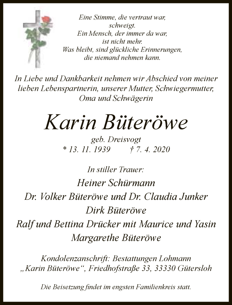 Hier finden Sie alle Traueranzeigen aus der Zeitung, die bisher für Karin Büteröwe erschienen sind. Weitere Traueranzeigen, die in der Zeitung erscheinen, werden hier ebenfalls aufgelistet