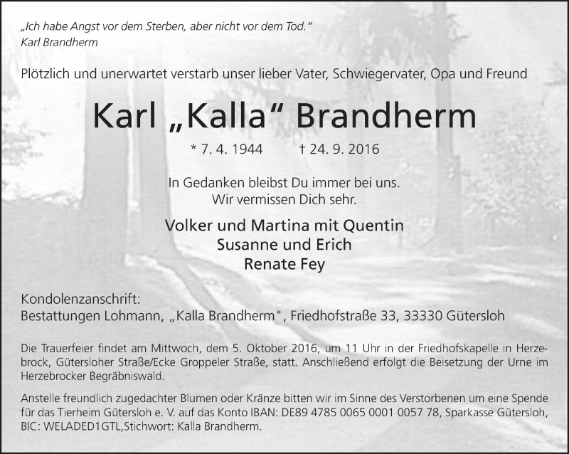 Hier finden Sie alle Traueranzeigen aus der Zeitung, die bisher für Karl Brandherm erschienen sind. Weitere Traueranzeigen, die in der Zeitung erscheinen, werden hier ebenfalls aufgelistet