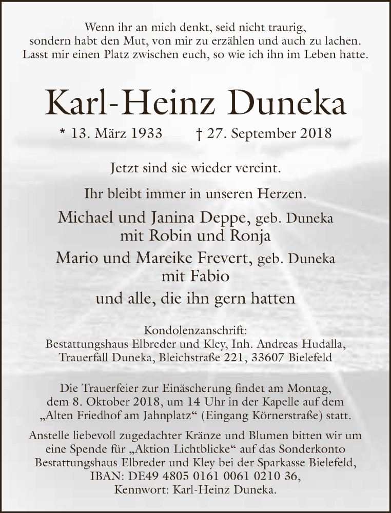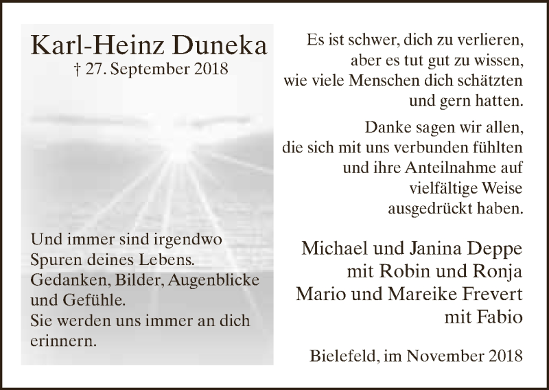 Hier finden Sie alle Traueranzeigen aus der Zeitung, die bisher für Karl-Heinz Duneka erschienen sind. Weitere Traueranzeigen, die in der Zeitung erscheinen, werden hier ebenfalls aufgelistet