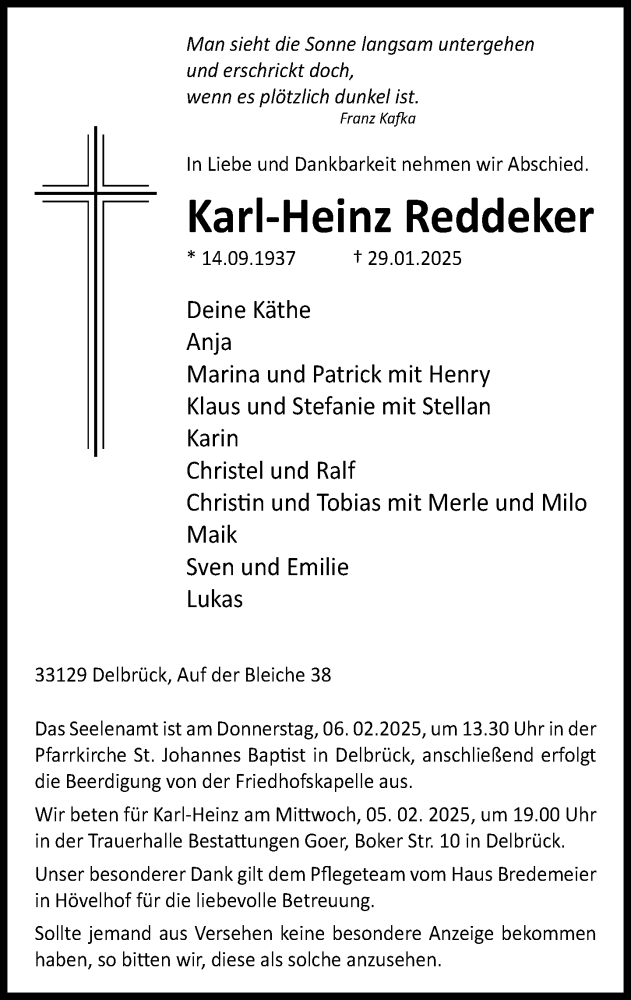 Hier finden Sie alle Traueranzeigen aus der Zeitung, die bisher für Karl-Heinz Reddeker erschienen sind. Weitere Traueranzeigen, die in der Zeitung erscheinen, werden hier ebenfalls aufgelistet