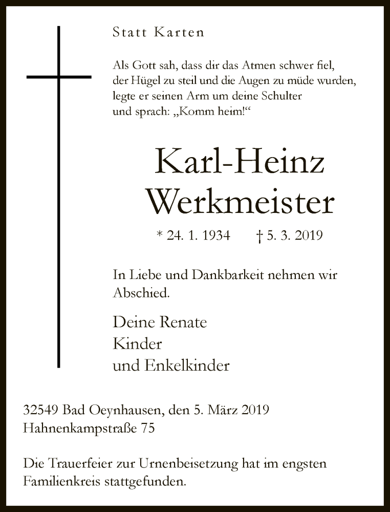 Hier finden Sie alle Traueranzeigen aus der Zeitung, die bisher für Karl-Heinz Werkmeister erschienen sind. Weitere Traueranzeigen, die in der Zeitung erscheinen, werden hier ebenfalls aufgelistet