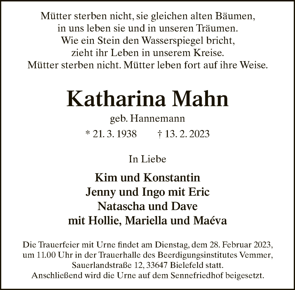 Hier finden Sie alle Traueranzeigen aus der Zeitung, die bisher für Katharina Mahn erschienen sind. Weitere Traueranzeigen, die in der Zeitung erscheinen, werden hier ebenfalls aufgelistet