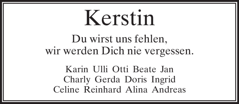 Hier finden Sie alle Traueranzeigen aus der Zeitung, die bisher für Kerstin erschienen sind. Weitere Traueranzeigen, die in der Zeitung erscheinen, werden hier ebenfalls aufgelistet