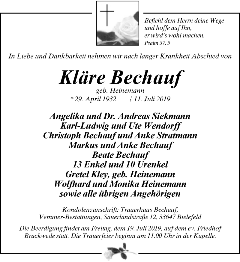 Hier finden Sie alle Traueranzeigen aus der Zeitung, die bisher für Kläre Bechauf erschienen sind. Weitere Traueranzeigen, die in der Zeitung erscheinen, werden hier ebenfalls aufgelistet