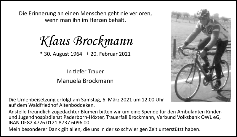 Hier finden Sie alle Traueranzeigen aus der Zeitung, die bisher für Klaus Brockmann erschienen sind. Weitere Traueranzeigen, die in der Zeitung erscheinen, werden hier ebenfalls aufgelistet