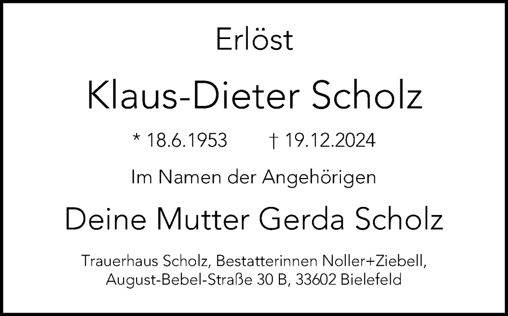 Hier finden Sie alle Traueranzeigen aus der Zeitung, die bisher für Klaus-Dieter Scholz erschienen sind. Weitere Traueranzeigen, die in der Zeitung erscheinen, werden hier ebenfalls aufgelistet