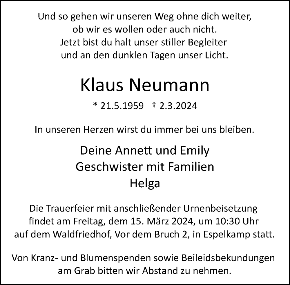 Hier finden Sie alle Traueranzeigen aus der Zeitung, die bisher für Klaus Neumann erschienen sind. Weitere Traueranzeigen, die in der Zeitung erscheinen, werden hier ebenfalls aufgelistet