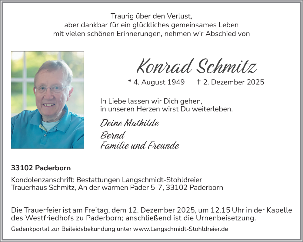 Hier finden Sie alle Traueranzeigen aus der Zeitung, die bisher für Konrad Schmitz erschienen sind. Weitere Traueranzeigen, die in der Zeitung erscheinen, werden hier ebenfalls aufgelistet