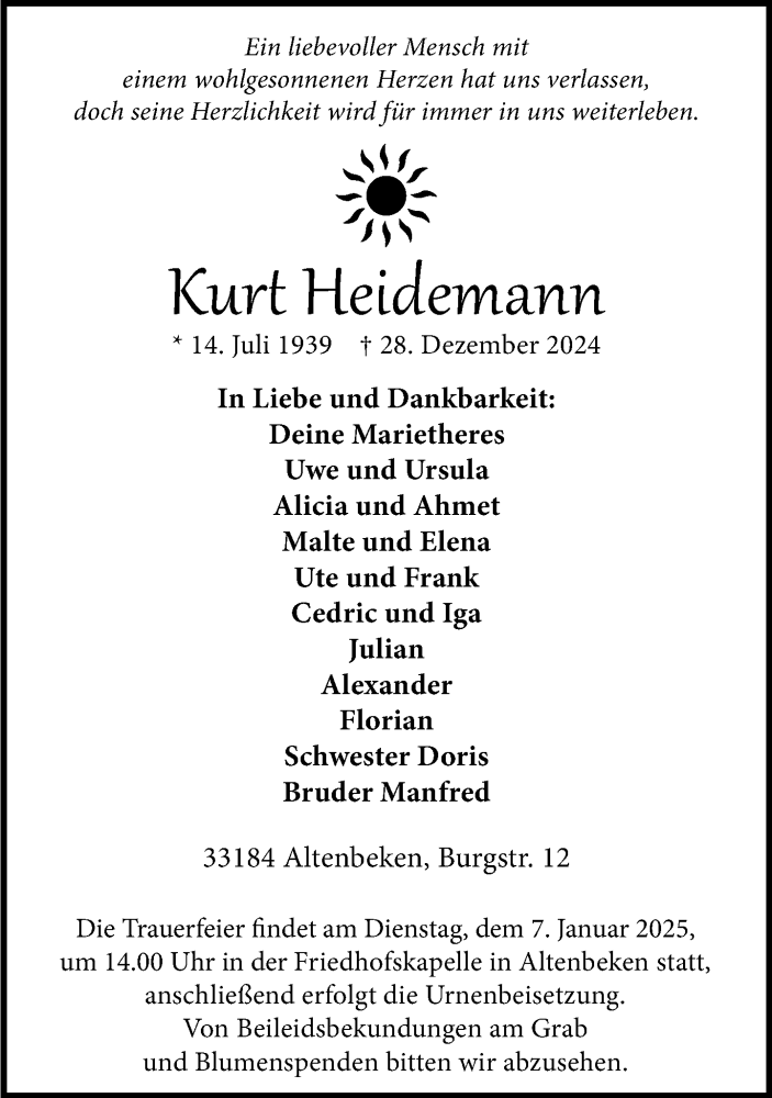 Hier finden Sie alle Traueranzeigen aus der Zeitung, die bisher für Kurt Heidemann erschienen sind. Weitere Traueranzeigen, die in der Zeitung erscheinen, werden hier ebenfalls aufgelistet