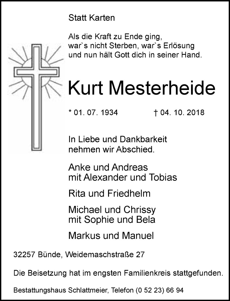Hier finden Sie alle Traueranzeigen aus der Zeitung, die bisher für Kurt Mesterheide erschienen sind. Weitere Traueranzeigen, die in der Zeitung erscheinen, werden hier ebenfalls aufgelistet