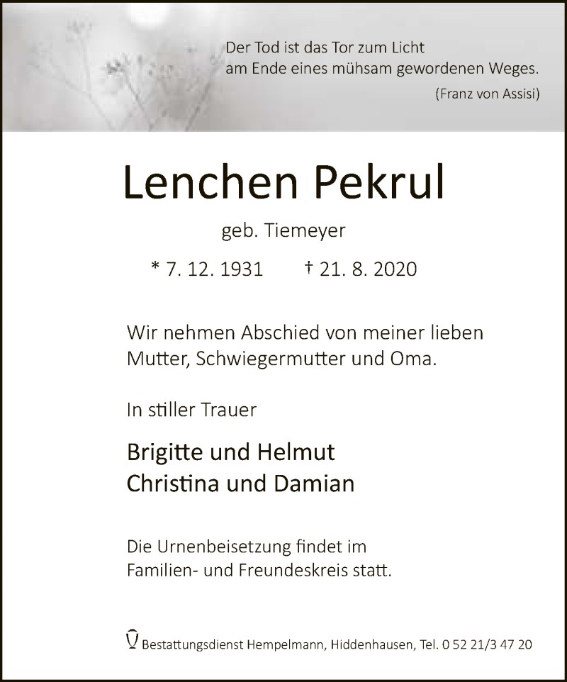 Hier finden Sie alle Traueranzeigen aus der Zeitung, die bisher für Lenchen Pekrul erschienen sind. Weitere Traueranzeigen, die in der Zeitung erscheinen, werden hier ebenfalls aufgelistet