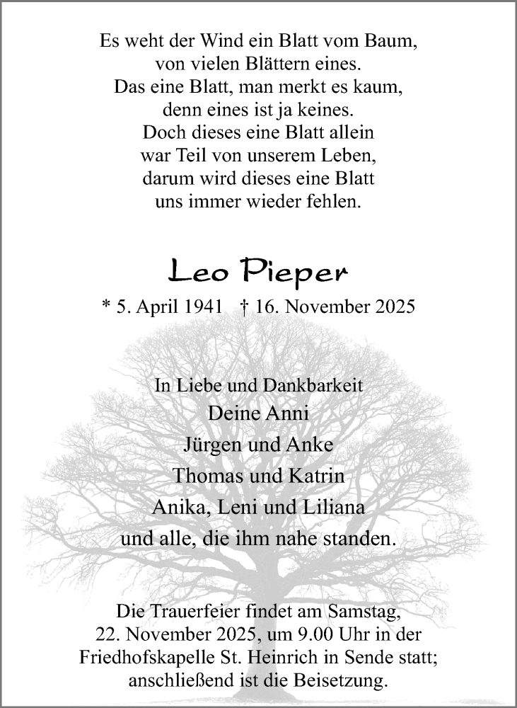 Hier finden Sie alle Traueranzeigen aus der Zeitung, die bisher für Leo Pieper erschienen sind. Weitere Traueranzeigen, die in der Zeitung erscheinen, werden hier ebenfalls aufgelistet